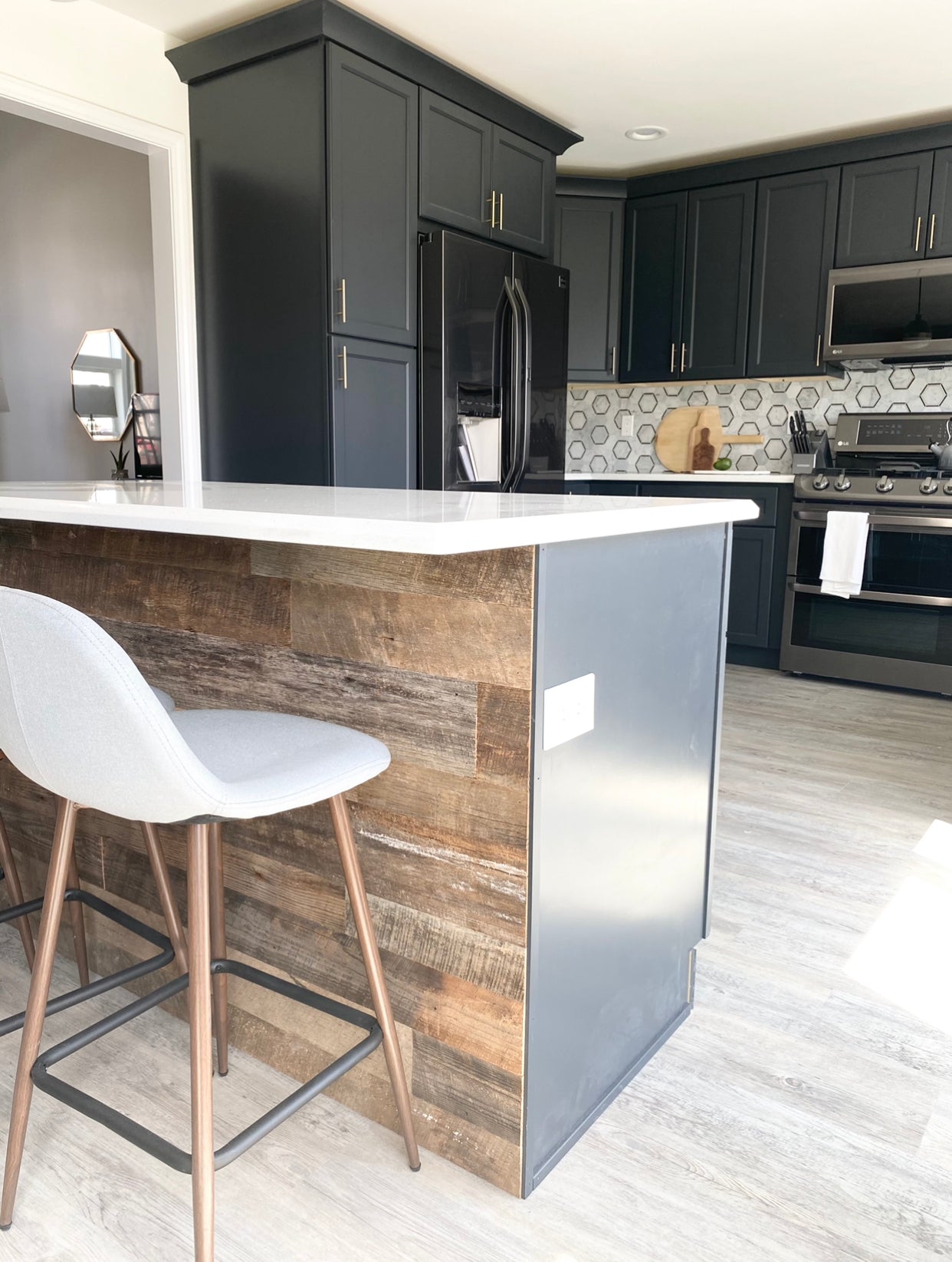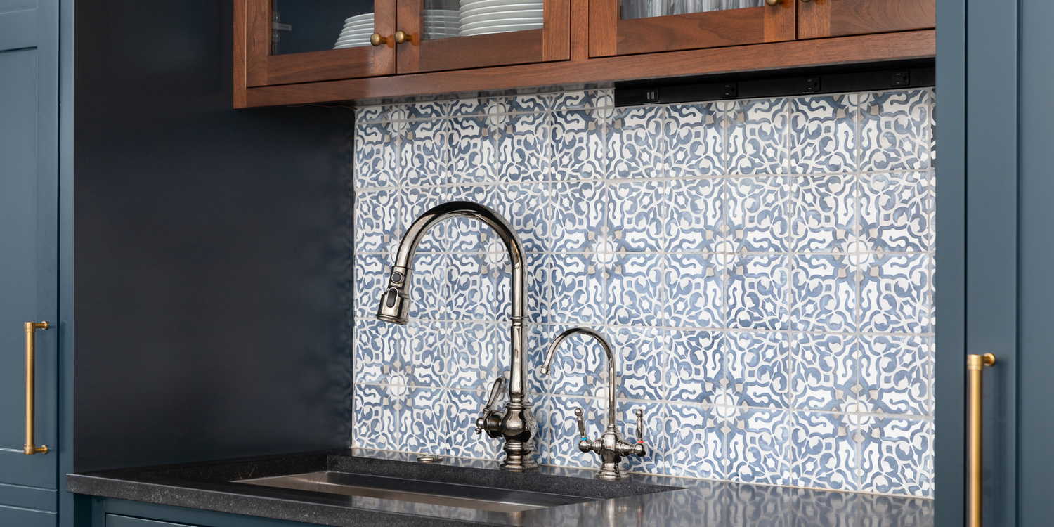This is where texture, pattern, and movement come in — tying the cabinets and flooring together into one cohesive story.