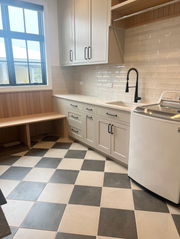 We decide the material first (tile, LVT, or wood), then dial in the color. This establishes warmth, contrast, and durability for daily life.
