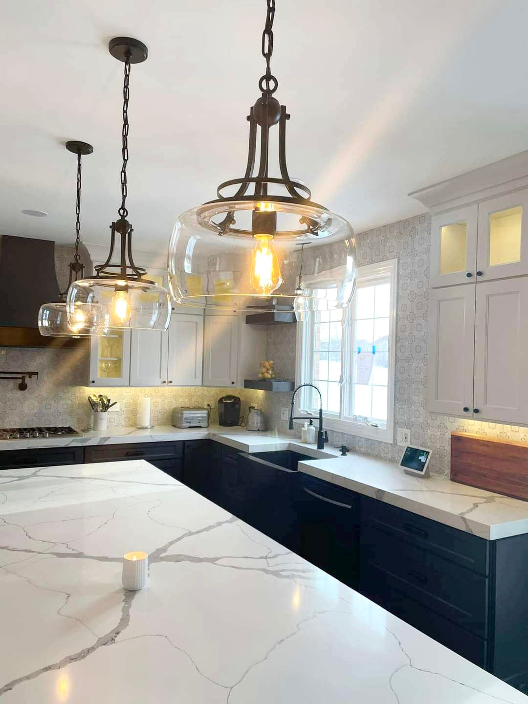 Task lighting, statement pendants, and ambient light are chosen to bring the kitchen to life.